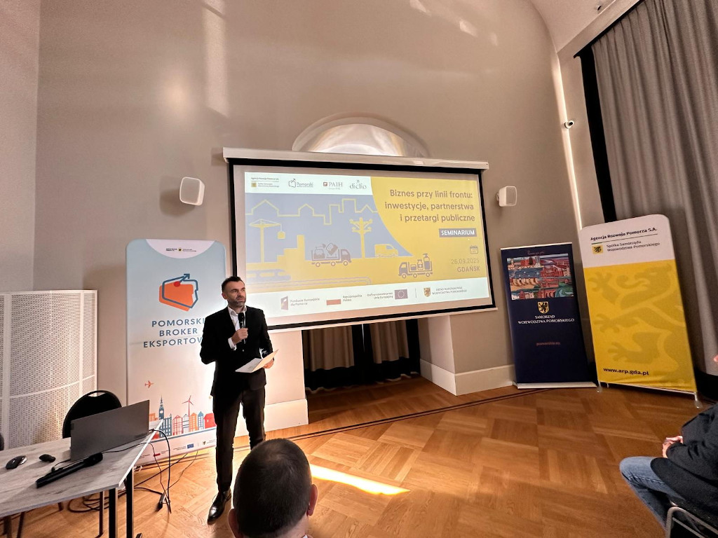 26 września 2025 r. w Gdańsku odbyło się seminarium „Biznes przy linii frontu: inwestycje, partnerstwa i przetargi publiczne”, zorganizowane przez Agencję Rozwoju Pomorza S.A. we współpracy z Urzędem Marszałkowskim Województwa Pomorskiego oraz Polską Agencją Inwestycji i Handlu. Wydarzenie skierowane było do przedsiębiorstw z sektorów budowlanego, meblarskiego, wentylacyjno-klimatyzacyjnego, energetycznego, transportowego oraz logistycznego, zainteresowanych aktywnym udziałem w procesie odbudowy Ukrainy i poszukiwaniem nowych możliwości współpracy gospodarczej.