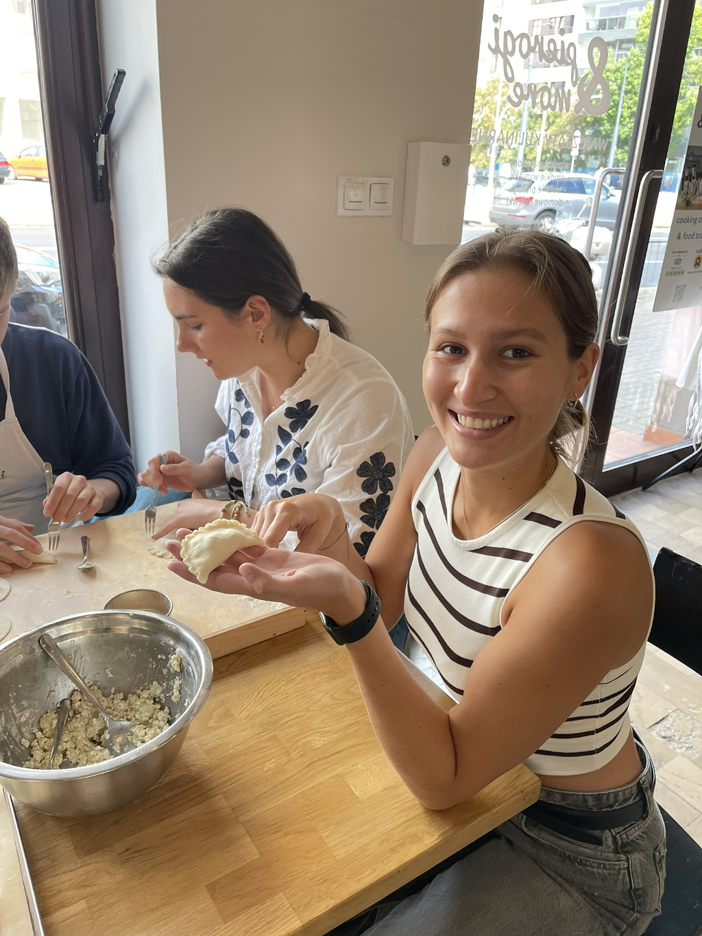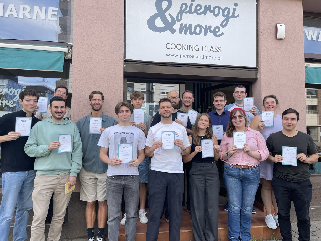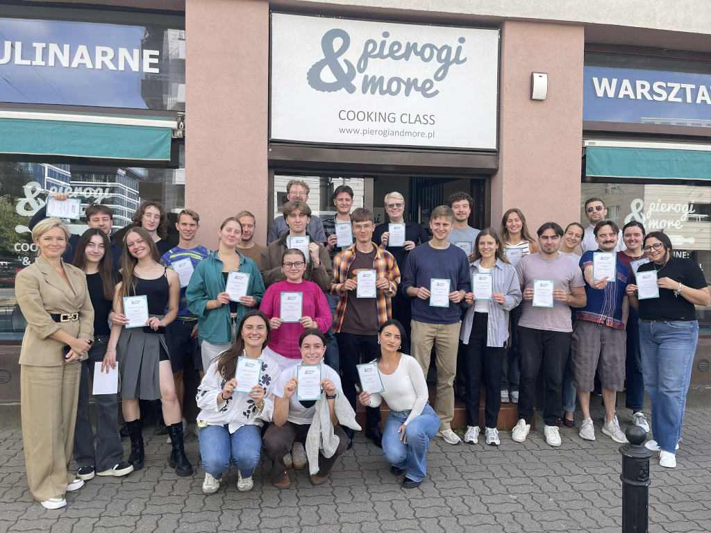W ramach spotkania stypendyści poznawali historię i sposób przygotowania tradycyjnego polskiego dania - pierogów. Po teoretycznym wstępie uczestnicy przeszli przez wszystkie etapy przygotowania tej ikonicznej polskiej potrawy, od mieszania składników farszu, przez wałkowania ciasta, aż po lepienia pierogów w najróżniejsze, również artystyczne kształty i gotowanie ich.